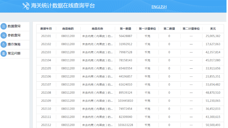 2021年我國(guó)未去內(nèi)殼(內(nèi)果皮)椰子進(jìn)口數(shù)據(jù)。(網(wǎng)頁截圖)